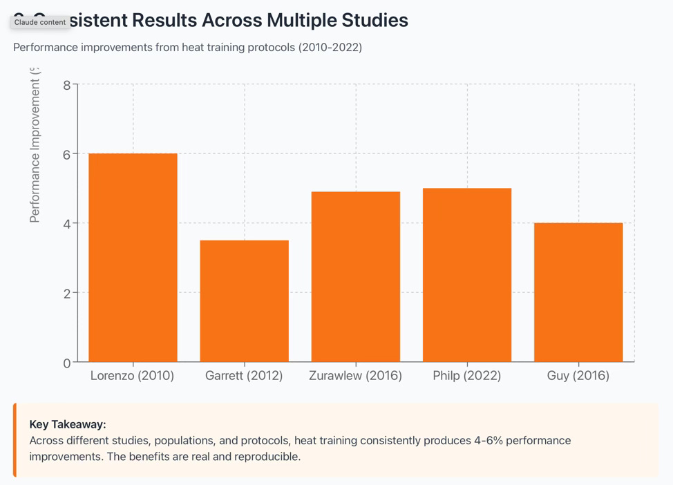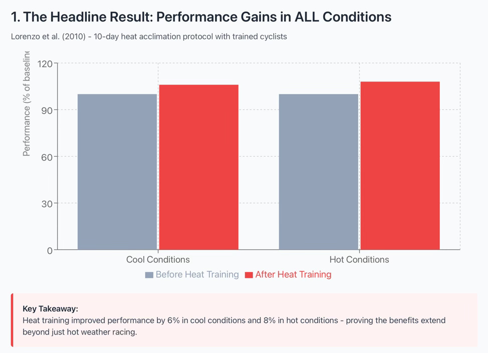 The Lorenzo Study (2010) changed the game. Cyclists completed 10 heat sessions over two weeks while continuing their usual training. The results showed a 7% improvement in time trial performance in hot weather and a 6% improvement in cool weather. This study showed that heat training isn’t just for coping with hot races—it can make athletes faster overall.