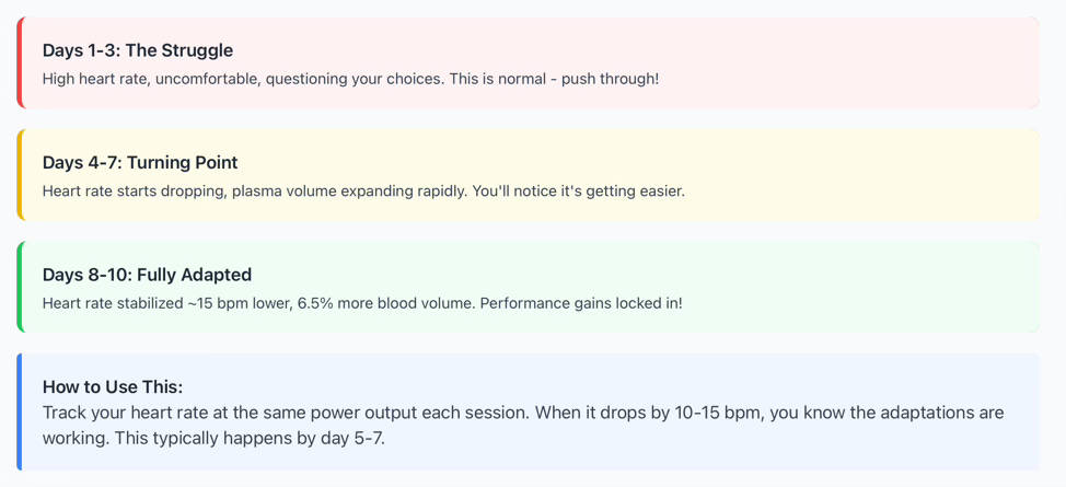Indoor Training Sessions work if you have a home gym where you can control the temperature. Turn up the heat to 34-38°C and set the humidity to 60-70%. Do 60-90 minute workouts at a steady, moderate effort (about 55-65% of your maximum effort or Zone 2 heart rate). The main goal is to keep your body temperature higher, not to push yourself to the limit. Ten sessions over 2-3 weeks can lead to significant changes. Several studies, including the Lorenzo and Garrett plans, used this method with excellent results.
